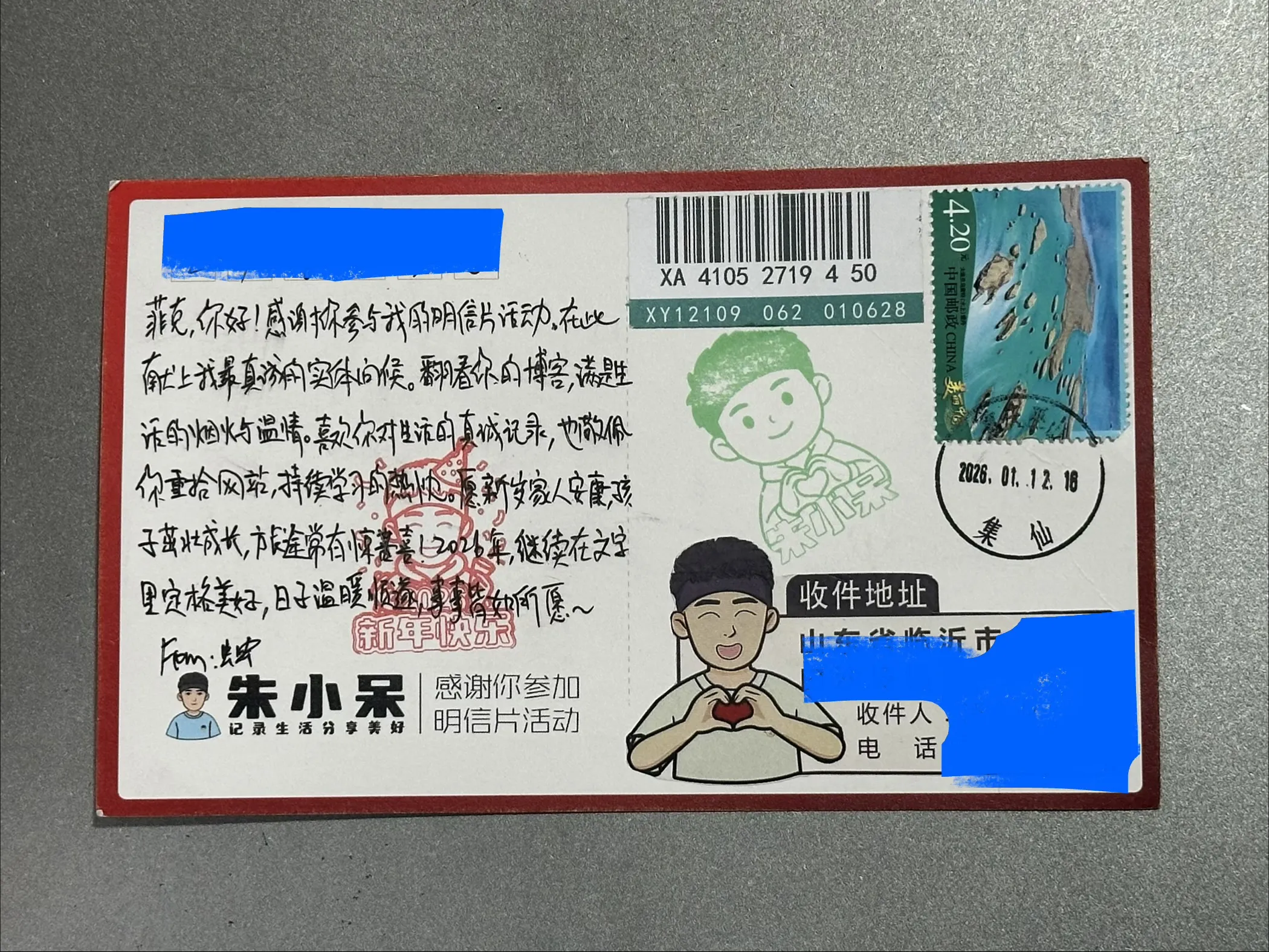几天前(1月15日)就收到了虫虫的明信片,写了满满一张的诚意。这是第二次参加明信片活动,初衷是为了拿到朱小呆网站的徽章,哈哈。虫虫很用心,设计了好多样式的明信片,然后还有很多新玩法。