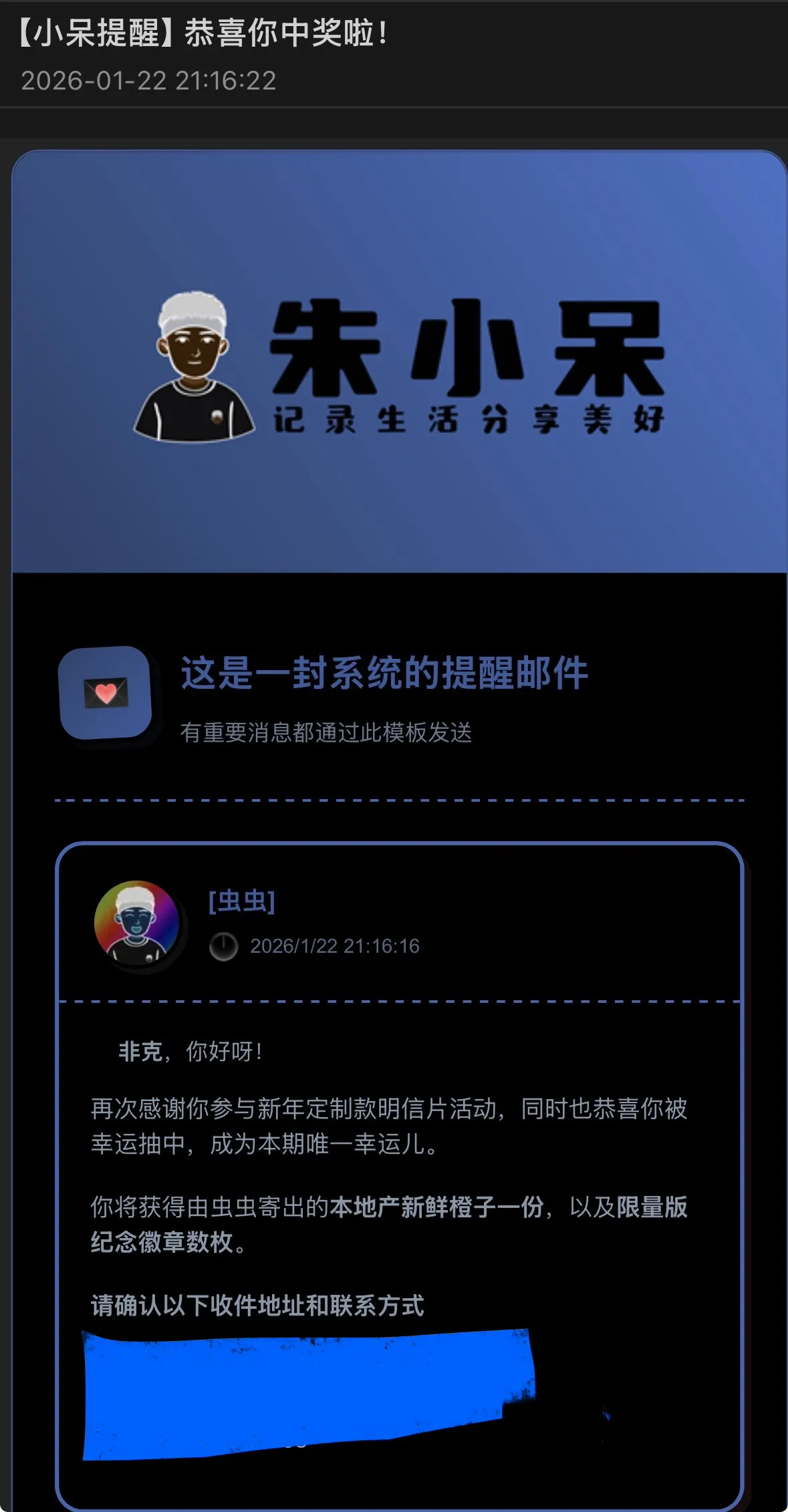 打开一看,原来是明信片活动的后续,还有抽奖环节。我这不管什么活动,大小奖一律不中的体质,居然还有这么幸运的时候。
