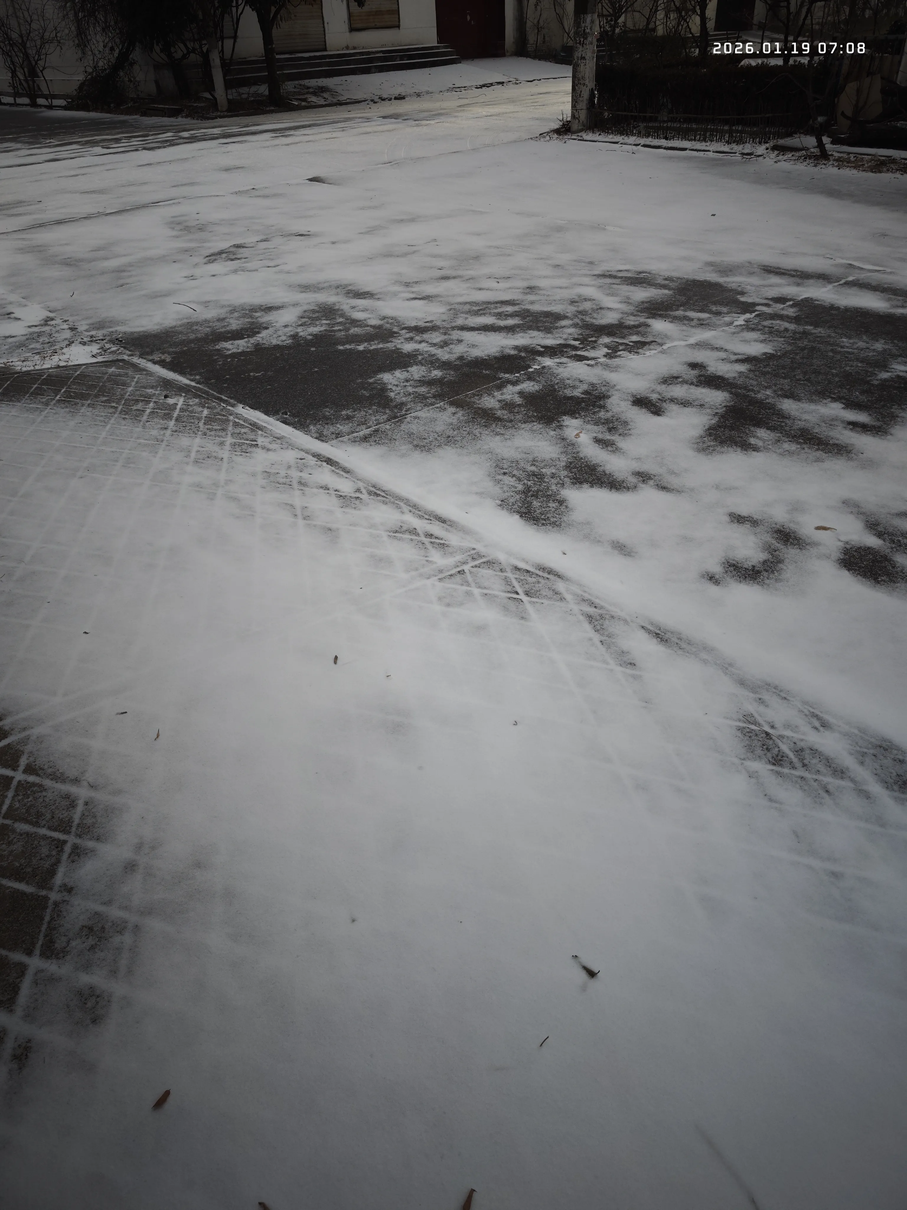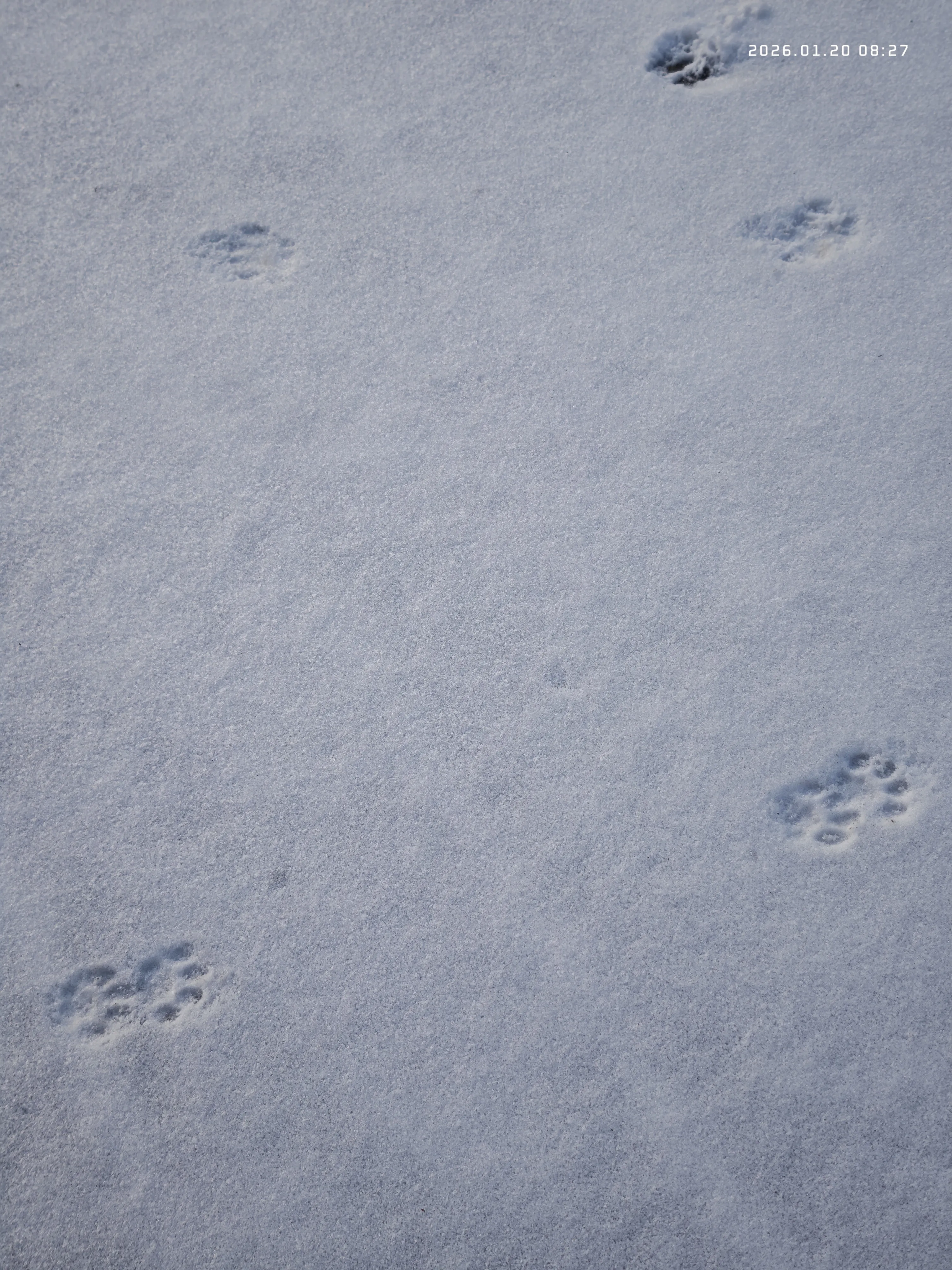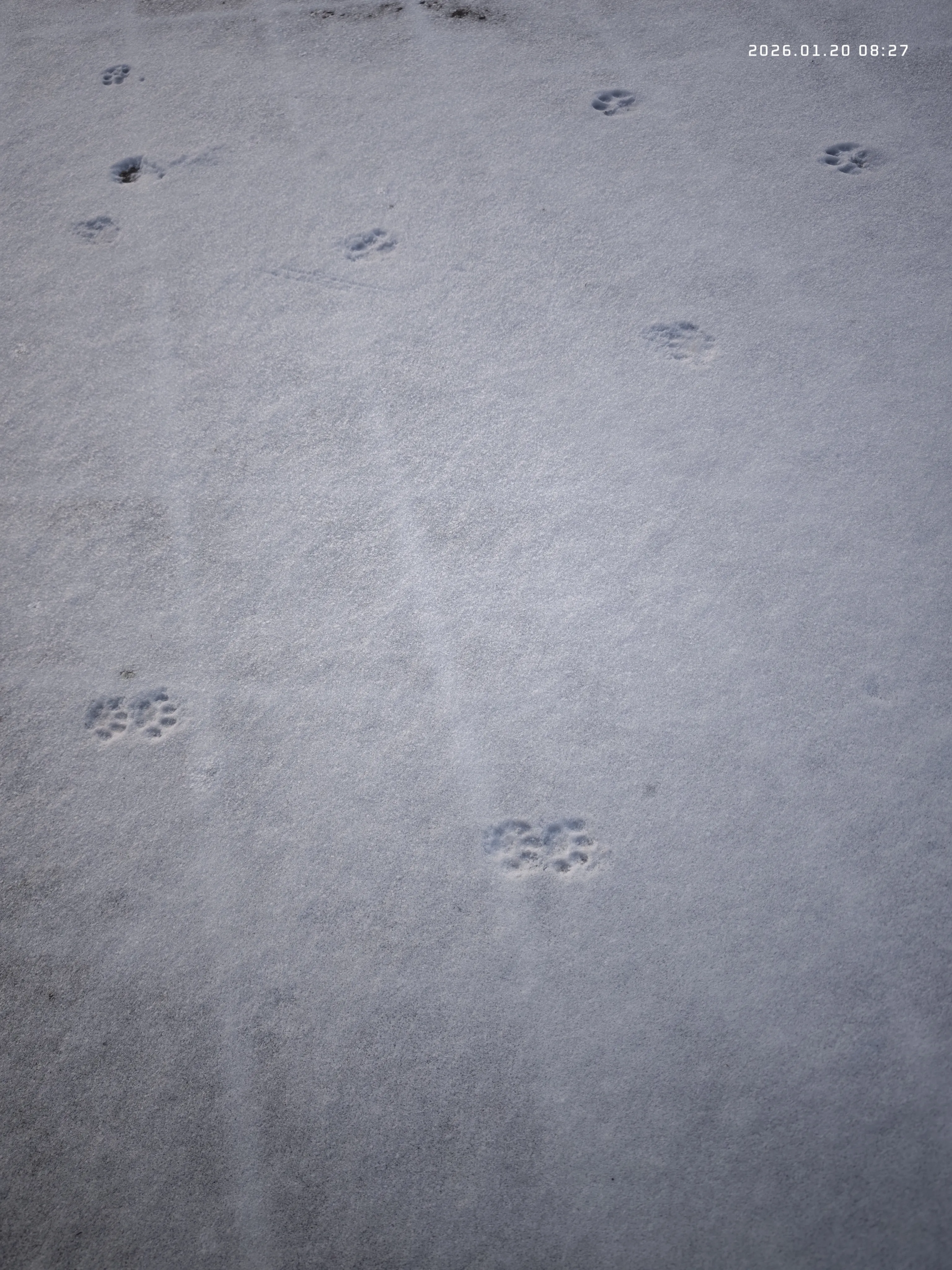 2026年第一场雪,1月19号,雨夹雪转的中雪,随着寒潮带来的低温,路面都结了冰,开车慢点也还可以,走路就有点太滑了。晚上断断续续的下了一夜,第二天早上起来,门口的地上,留着几枚小脚印,大概是附近的流浪猫在雪地里画下的。